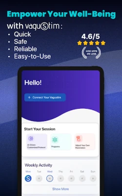 „Vagustim" atveria naują gerovės dimensiją, pasitelkiant modernią nešiojamąją technologiją, kuri per ausis tiekia saugius, švelnius impulsus. Ši pažangi programėlė yra nepakeičiamas kompanionas jūsų „Vagustim" įrenginiui, suteikiantis galimybę sklandžiai valdyti ir pritaikyti kiekvieną seansą pagal individualius sveikatos tikslus. Nesvarbu, ar siekiate sumažinti kasdienį stresą, pagerinti miego kokybę, sustiprinti virškinimo sistemos sveikatą ar pagreitinti atsistatymą, ši programėlė yra jūsų asmeninis kelias į harmoningesnę savijautą.